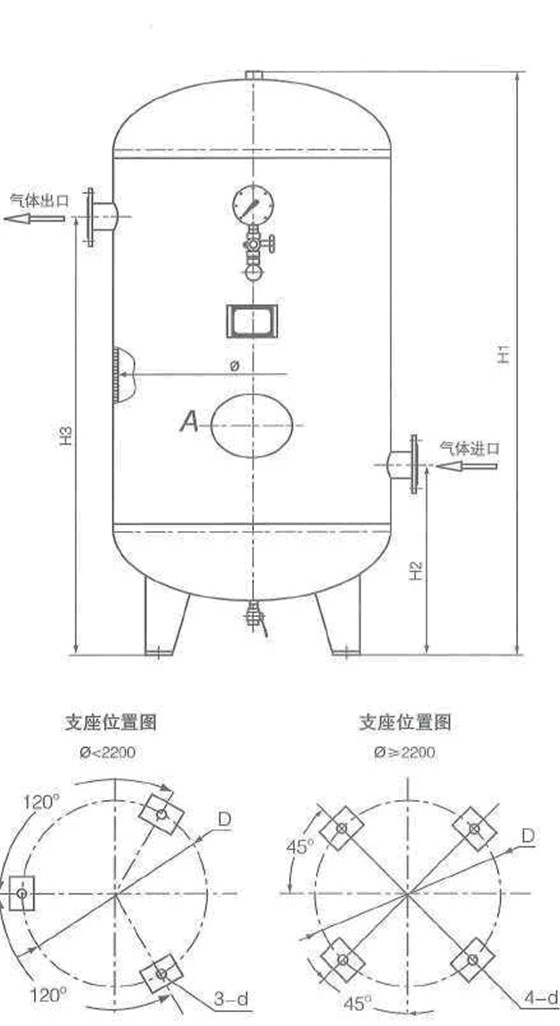 壓力的作用,避免空壓機(jī)頻繁加卸載和除掉大部分的液態(tài)水。儲(chǔ)氣罐一般由筒體、封頭、法蘭、接管、密封元件和支座等